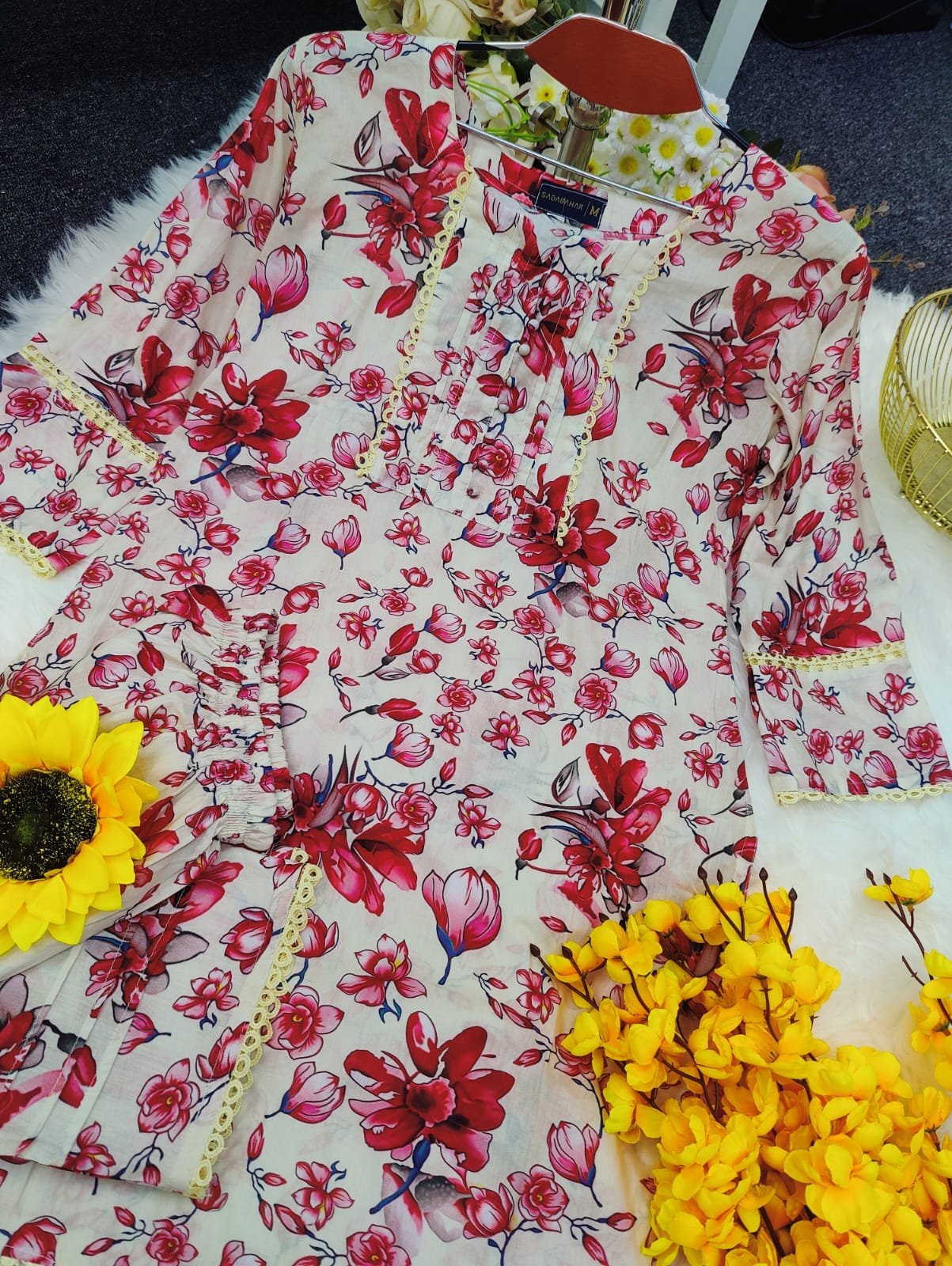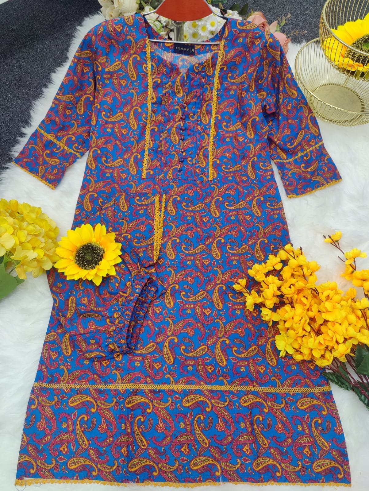 জামার বিবরণ:- সুতি কাপড়ের উপর ডিজিটাল প্রিন্ট এর কাজ করা থাকবে এবং কি লেইস এর কাজ করা থাকবে।