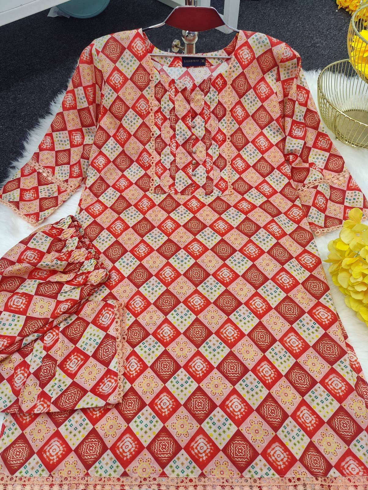 সেলোয়ার:- সেম প্রিন্ট এর কাজ করা এবং কি নিচে সুন্দর করে লেইস এর কাজ করা থাকবে ।