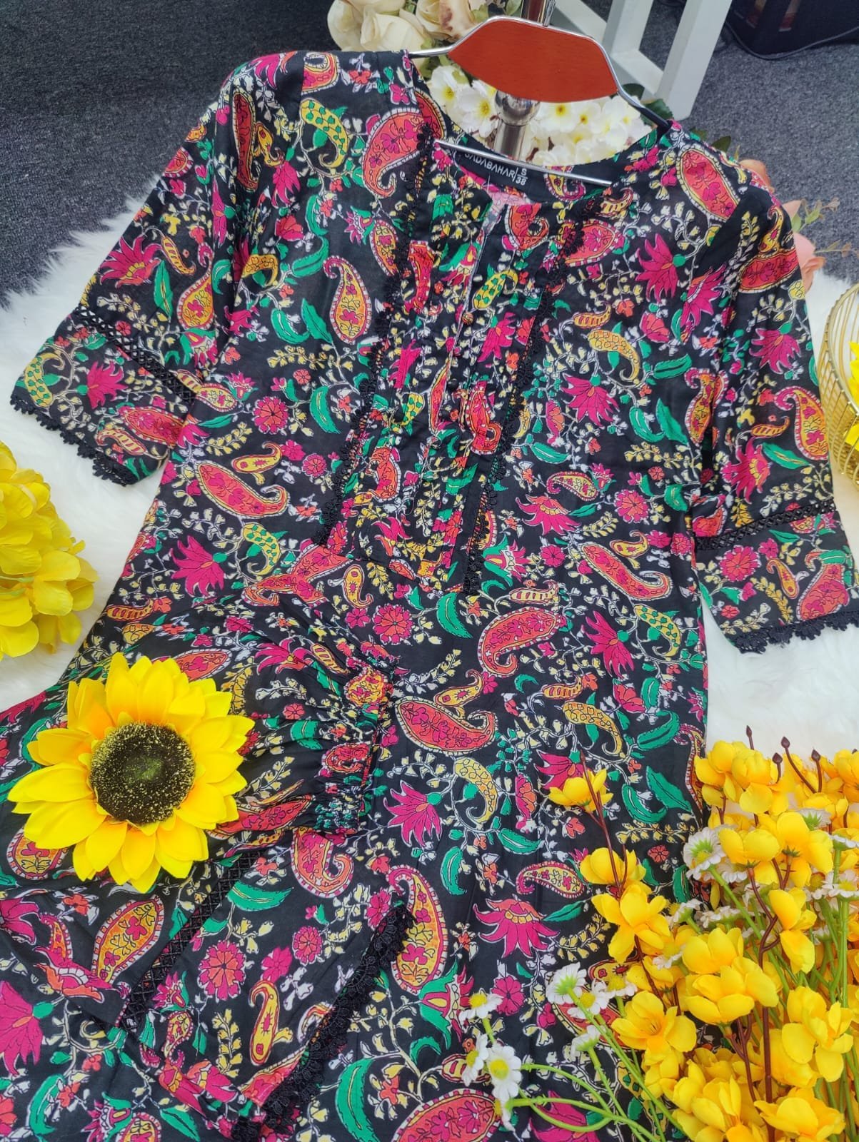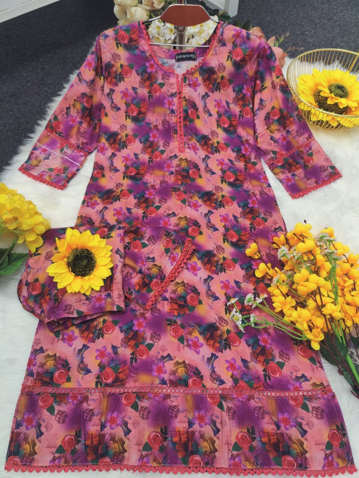 জামার বিবরণ:- সুতি কাপড়ের উপর ডিজিটাল প্রিন্ট এর কাজ করা থাকবে এবং কি লেইস এর কাজ করা থাকবে।