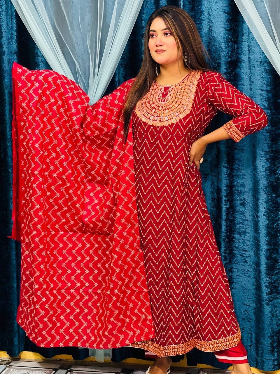 💥রেডিমেড গ্রাউন্ড💥(থ্রি পিস) জামার গলায় ও নিচের পেনেলে সিকুয়েন্স ও এম্বডারি কাজ করা আছে ফুল বডিতে ডিজিটাল পিন্ড করা ওড়নায় ডিজিটাল পিন্ড করা সেলয়ার বাটার সিল্ক বিবরণ ✅বডি ফ্রি সাইজ ✅লং-৪৮ ✅সেলোয়ার -৩৮ ✅ওড়না ৫ হাত