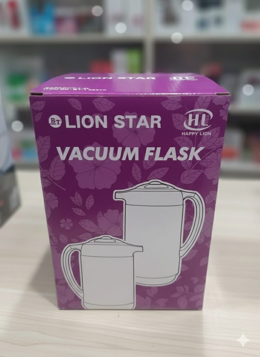 ​এই বাক্সটি “লায়ন স্টার” ব্র্যান্ডের একটি ভ্যাকুয়াম ফ্লাস্কের প্যাকেজিং নির্দেশ করছে। ফ্লাস্কটি “হ্যাপি লায়ন” (Happy Lion) লোগো সম্বলিত।