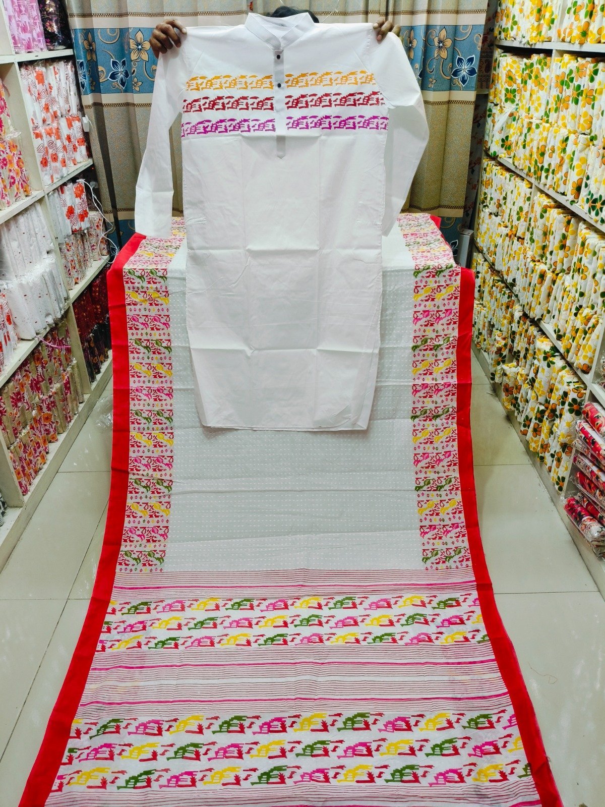 Premium Quality Couple Dress  হাফ সিল্ক শাড়িতে স্কিন প্রিন্ট কাজ করা ও   ধুপিন্যান সিল্ক পাঞ্জাবিতে ব্লক প্রিন্ট কাজ করা | প্রোডাক্ট টাইপ:- হাফ সিল্ক শাড়ি। ধুপিয়ান সিল্ক পাঞ্জাবি। শাড়ির লং ১২ হাত। স্কিন প্রিন্ট ও ব্লক প্রিন্টের কাজ করা।  পাঞ্জাবি সাইজ-৪০,৪২,৪৪,৪৬ আধুনিক ও মান সম্মত ডিজাইন। অরিজিনাল প্রোডাক্ট।