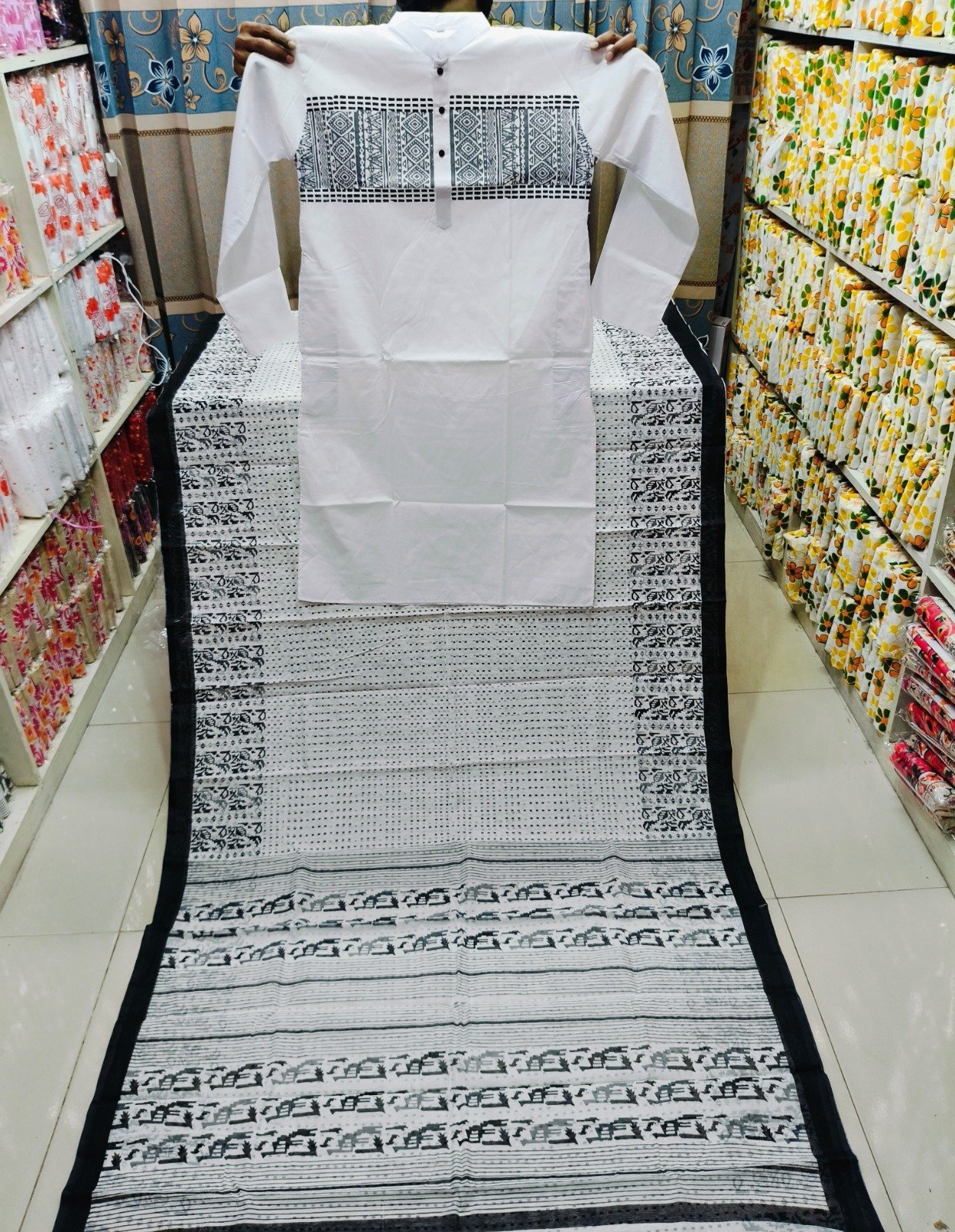 ধুপিন্যান সিল্ক পাঞ্জাবিতে ব্লক প্রিন্ট কাজ করা |
